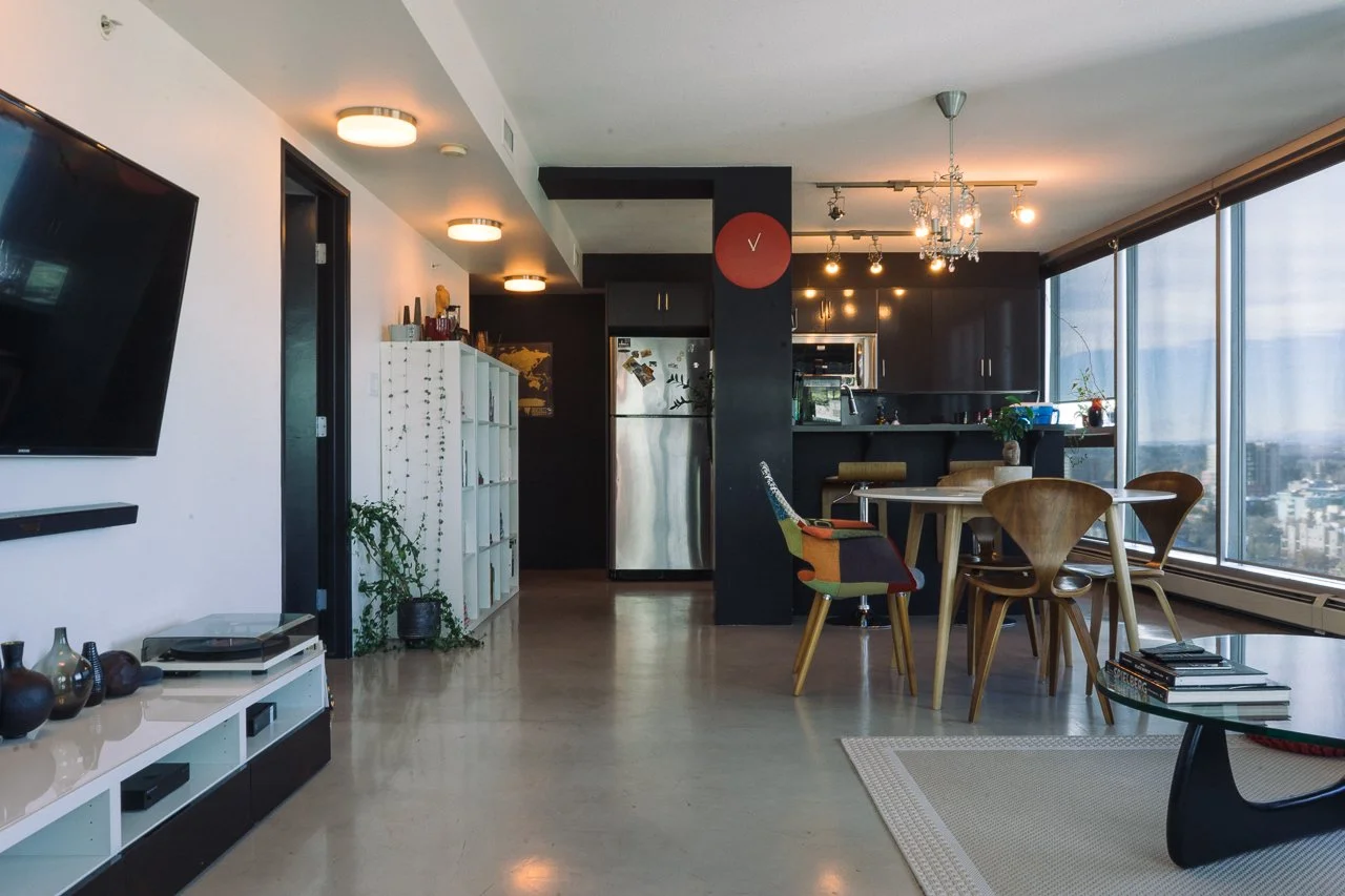You can feel free to eat in this space, but depending on the couch material and colour, you may want to use a throw blanket as a seat cover to protect your couch. There are no rules with dark leather, but with a beige fabric couch, you need to show it some extra love.